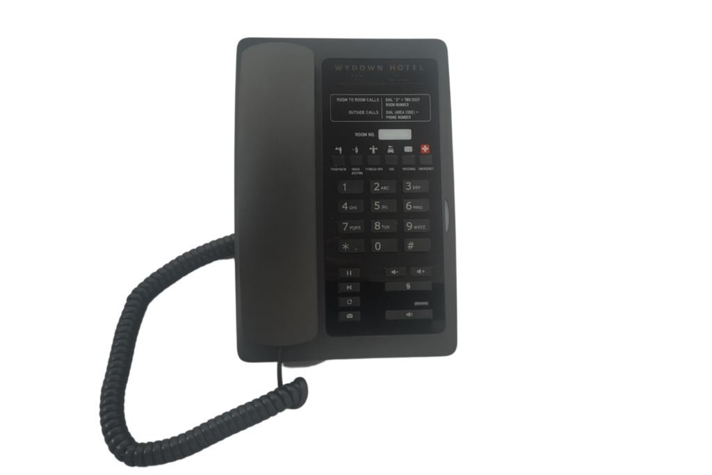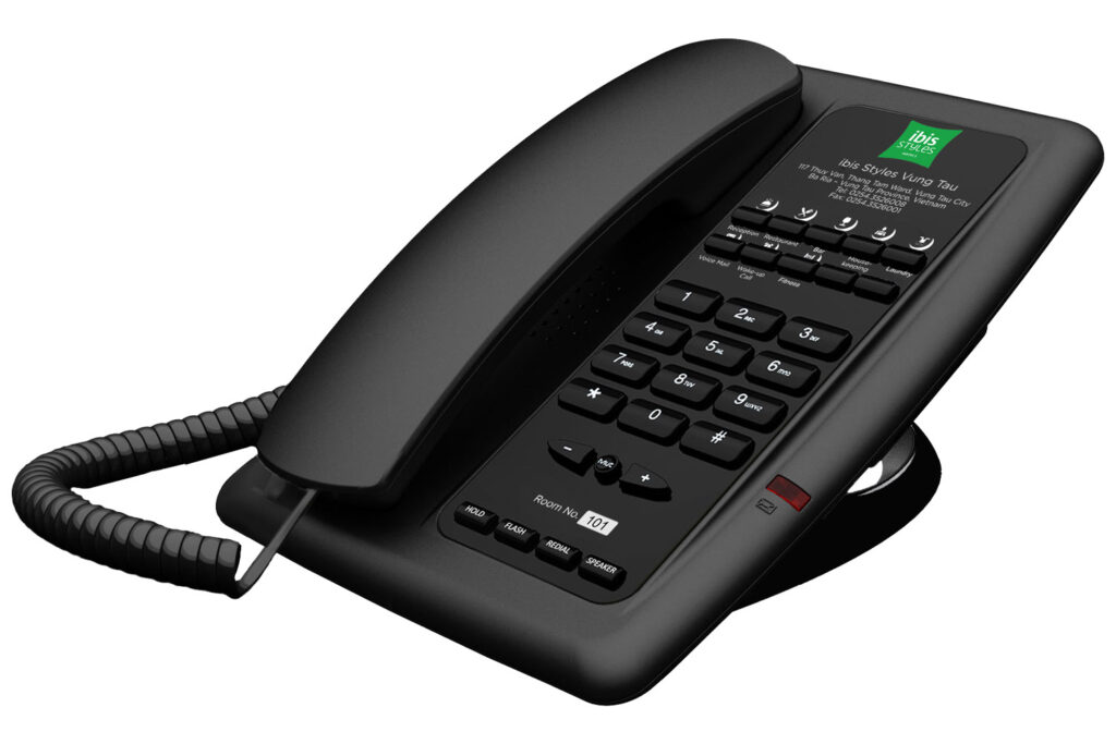 The Vivo Nordic hotel phone from Hotel Technology International, available in black with silver trimmings, is an elegantly designed, small footprint hotel telephone. As well as it’s scandi style visual appeal, this phone comes with 6 guest service key and redial and flash keys. The Vivo Nordic hotel phone is ideal for hotels looking for a more stylish hotel guest room telephone. This is an analogue small footprint hotel guestroom phone with single line, 6 GSK, Redial, Volume, Speaker.